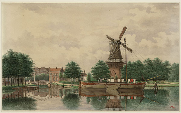 Dit is een foto van de Singelgracht ter hoogte van het voormalige bolwerk Sloterdijk met korenmolen De Kraay. Om in de achtergrond de zijkant van de Willemspoort te kunnen ontdekken moest u al het origineel in de Beeldbank vinden, om in te kunnen zoomen.