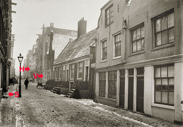 Op de bovenste foto zijn zijstraten aangegeven: H=Haarlemmerdijk, V=Vinkenstraat en S=Schapensteeg