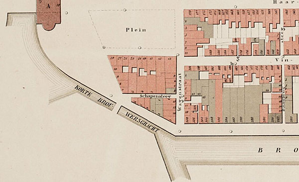 is al een tijdelijke doorbraak van de Brouwersgracht te zien, die in 1893 rechtdoor getrokken is (zie buurtkaart UU links).