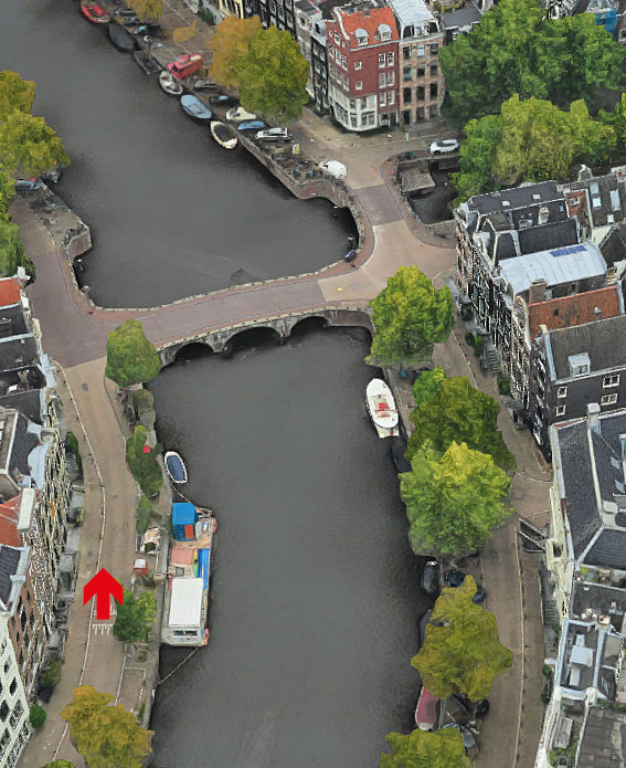 De foto maakte duidelijk dat Stef op een der hoofdgrachten stond, precies in een knik. De binnenknik is dan altijd de oneven zijde. De rode pijl geeft de standplaats van Stef aan.