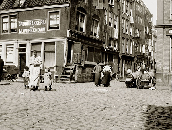 Wij omschreven deze foto van Jacob Olie uit 1902, die hij maakte op het Markenplein, gezien naar de Joden Houttuinen.