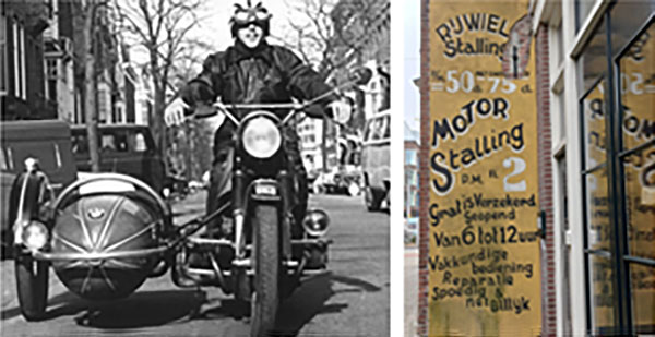 J. Rombouts, de ‘snapshot’-fotograaf van het begin 20e eeuw, legde deze keurig geklede fietsende dames vast. Vrouwen beschouwden deze nieuwe ‘machine’ als een manier om meer bewegingsvrijheid dus onafhankelijkheid te krijgen. Helaas was hun kleding nogal onpraktisch. Zoals een krant al in 1895 berichtte: “Zij kunnen het rijwiel niet zoo makkelijk beklimmen, en er niet zoo vlug afspringen; hare rokken loopen gevaar in de wielen verward te geraken, de wijde plooien van hare japonnen vangen te veel wind”. Uiteraard was er weerstand tegen fietsende vrouwen; vooral als zij dit als sport wilden beoefenen. Het weerhield deze twee langgerokte dames in ieder geval niet zich op een verlaten doch brede weg op het rijwiel te begeven. Bonusvraag: welke religieuze instelling zien we op de achtergrond?