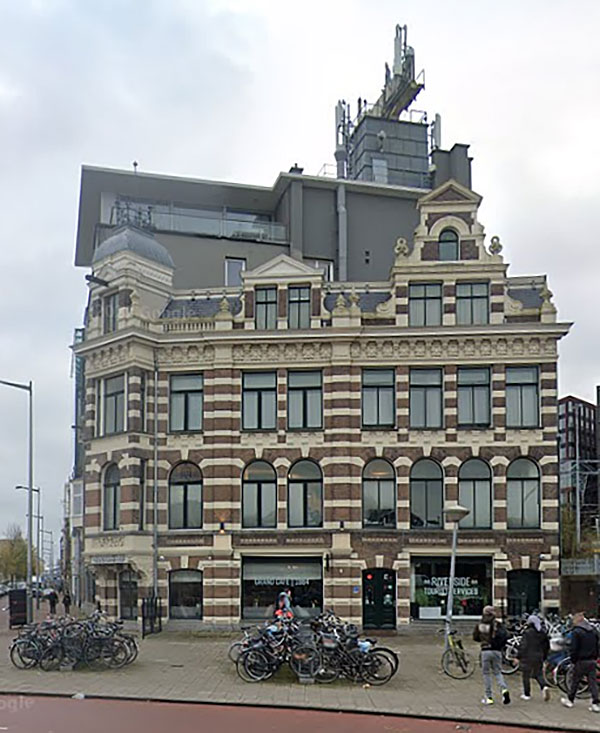 Dit hoekpand, gebouw De Zeevaart, staat op de De Rijterkade 105-106 aan de Oosterdoorgang. Het werd ooit in 1884-'85 voor vishandelaar Te Mijtelaar gebouwd door Yme Bijvoets. In 1906 was op dit adres de sanitair-firma Van Heemstede-Obelt gevestigd (die van het zwembad in 't IJ). Het pand werd vergroot met een laagbouw die het huisnummer nr.104 kreeg, maar dat deel werd in 1993 weer gesloopt voor de verbreding van het spoor. Naast dit gebouw, op nr.107 staat het kantoor van Vinke & Co met een grote reclame op het dak.