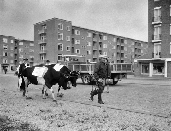 Boer Piet de Jong met koeien en borden in Amsterdam, zegt de beschrijving ietwat cryptisch. Het lijkt mij dat hij ergens aan de stadsrand loopt te protesteren. Er waren destijds nog heel wat boerenbedrijven in de polder. Ik kan die ‘borden’ op de twee koeien helaas niet lezen, dus het blijft gissen naar deze eenmansprotestactie. Waar is dit en als extra vraag: kan u achterhalen waartegen De Jong protesteert?