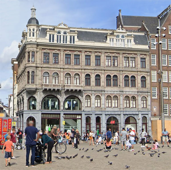 Foto: Google Street View Vreemd genoeg was de paal met schijnwerpers, waarmee het paleis wordt verlicht, de spoiler op deze foto. We kijken hier naar Dam 4, ooit gebouwd voor de kledingwinkel 'Magazijn Nederland' van de familie Kattenburg, nu een vestiging van H&M. Tijdens de Tweede Wereldoorlog was in de winkel een wervingsbureau van de Nederlandse SS. De grote boogramen boven de winkel met het gehate logo van de SS moesten het na 5 mei 1945 ontgelden.