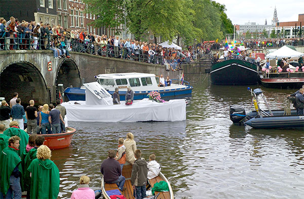 Canal Parade 2005, 10e editie, op de Amstel bij de Prinsengracht, georganiseerd door Gay Pride. Links: welfbrug 76 over de Prinsengracht. De Parade wordt aangevoerd door een sloep, waar aandacht wordt gevraagd voor twee homo's die vanwege hun seksuele geaardheid in Iran zijn opgehangen.