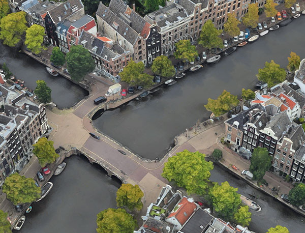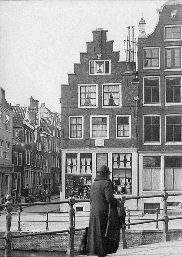 "Even concentreren op deze omschrijving... ik sta op een brug aan een gracht en neem een foto van de andere oever waar ook een brug te zien is. Beide bruggen liggen 'in' dezelfde gracht en over zijgrachten. Er komen met dit verhaal vast meerdere foto's in aanmerking, maar op mijn foto is in de huizenrij aan de overkant net een huis afgebroken. Als ik nu ga kijken wat ervoor in de plaats kwam, waren dat zelfs twee huizen, vervangen door een tamelijk fantasieloze nieuwbouw."