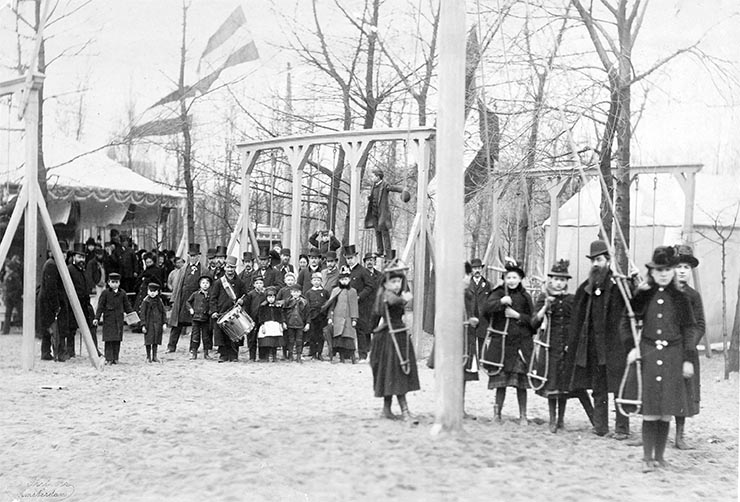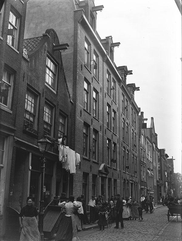 Straatleven in de Jordaan, volgens de foto die geschonken is door de Gezondheidsraad naar aanleiding van een rapport uit 1913. (Mogelijk het rapport De verbetering der volkshuisvesting te Amsterdam, Amsterdamsche Woningraad, 1913) De foto maakt onderdeel uit van een serie die sterk verpauperde sloppen en gangen laten zien. Opvallend genoeg geen interieurfoto’s. In die serie is deze foto atypisch. Het toont niet per se de verpaupering, maar het leven van alledag in de Jordaan. Op de linker deurpost (of is het een poort naar een gang?) zie je een rond bordje ‘14’. Wie kan ons vertellen wat dat bordje betekent?