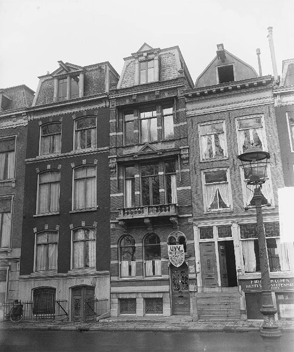 Een inkoppertje vond Arjen deze foto. De mannen zitten in het plantsoen op het Frederiksplein. De huizenrij aan het plein gaat rechts over in de Achtergracht. Diverse inzenders vonden geen consulaat, maar het kantoor van de stichting Unie van Vrijwilligers op nummer 21. De UVV had én heeft nog steeds een logo dat lijkt op een wapenschild. De stichting bestaat nog steeds, maar is elders gehuisvest.