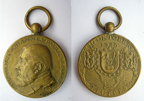 Ze kunnen hem nog niet vergeten... Paul Kruger, de charismatische leider der Boeren in hun opstand tegen de Engelsen. Op 10 oktober 1925 wordt zijn 100ste geboortedag herdacht, o.a. met deze penning. Op de achterzijde het wapen van Transvaal in een stralenkrans op de kaart van Zuid-Afrika geprojecteerd. In de oude Lutherse Kerk op het Spui wordt een herdenkingsdienst gehouden.