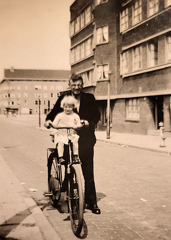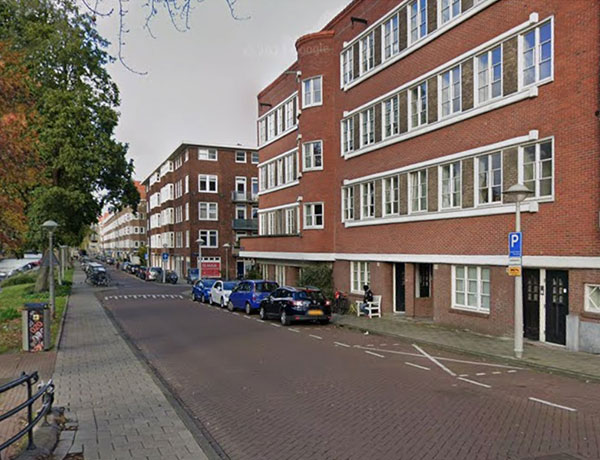 Zij poseren op de Admiralengracht bij de kruising Jan Evertsenstraat. Het woningcomplex op de voorgrond is een fraai ontwerp van Van der Mey, een mix van Amsterdamse School en De Stijl. Het complex kwam in 1927 gereed. De woningen op de achtergrond (Pieter van der Doesstraat) zijn van 1932. Tussen de twee woningblokken lijkt een plein of plantsoen. Op deze plek zou het tweede Sportfondsenbad verrijzen, groter dan het eerste Sportfondsenbad in Oost. Door de crisis van de 30er jaren ging dit plan niet door. Er werd uiteindelijk in 1937 toch een zwembad gebouwd, maar bescheidener van opzet. De rest werd bebouwd met woningen. Het betekent dat de foto tussen 1932 en 1937 is gemaakt. Het zwembad is in 2006 vervangen door woningen.