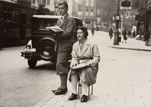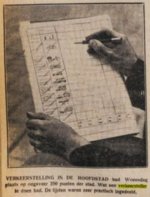 De door De Bilt voorspelde sneeuw is hedenmorgen in de hoofdstad gevallen, staat op de achterkant van deze Polygoon-persfoto geschreven. Sneeuwval is net zoals bijvoorbeeld de eerste lenteboden een geliefd onderwerp voor deze fotografen. Veel sneeuw is er niet gevallen, zo te zien. De fotograaf heeft volgens mij gewoon een raam in zijn woonkamer opgeschoven en dit plaatje gemaakt. Hij vond het lijnenspel van de bandensporen wellicht ook een reden om de foto vanuit zijn huis te maken.