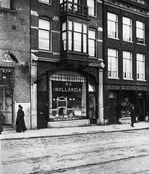 De firmaopschriften leidden u rechtsstreeks naar de laatste huizen op het Rokin. Het meest linkse was al vervangen door de nieuwbouw van de Nederlanden van 1845. De deur is er vandaag nog steeds. De huizen rechts daarvan zijn Rokin 170-172 en die werden afgebroken om plaats te maken voor het warenhuis van Vroom & Dreesmann.
