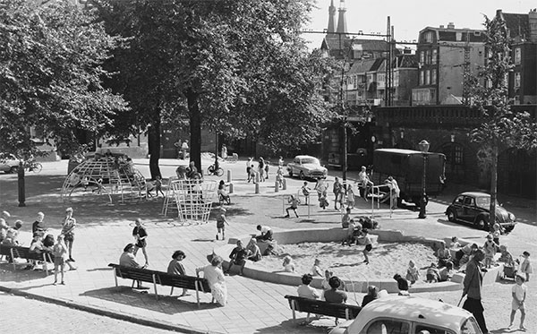 Ook de speelplaatsen op de Herenmarkt en het Hendrik Jonkerplein vonden we leuk gevonden, met dezelfde Posthoorn in het verschiet.