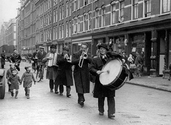 Straatmuzikanten lopen al spelend door een onbekende straat. Waarom zij daar musiceren staat er niet bij. Was het een aubade voor een bekende of jubilerende buurtbewoner? Trokken muzikanten door de buurten om iets bij te verdienen in de crisisjaren (de foto is van 1935)? Was er ergens een concours voor straatmuzikanten? Gelet op de kleding is het geen warme dag. Geen dag waarop je publiek trekt die een duit in je centenbak gooit.