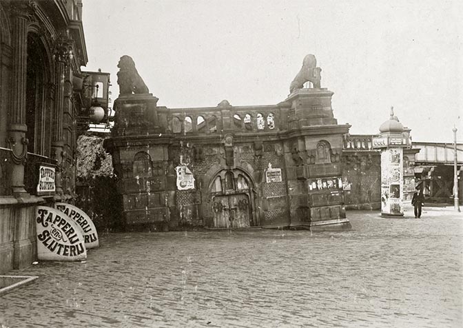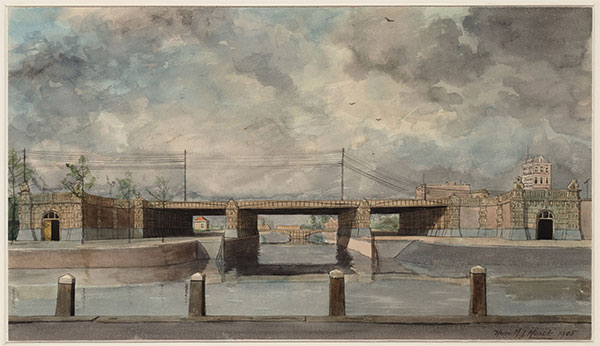 "Iemand stuurde ooit deze prentbriefkaart met een wijds gezicht op het begin van een laan. Van hieruit gezien was de linkerkant van die laan volledig bebouwd met woonhuizen, enzovoort. De rechterkant lijkt meer op een park, maar aan het begin staan enkele grote gebouwen met vooraan een rond pand. Voorlangs een gracht en een brug en een vrachtscheepje. Over de brug rijdt net een tram; de kaart lijkt oud maar het is toch al een elektrische tram. Rechts onderaan is een loopbrug te zien; daar heeft een pdf laatst uitvoerig over gerept. De fotograaf stond zó hoog dat dit bijna een vogelvluchtopname is. Waar zou hij gestaan hebben? Vast een ander hoog gebouw.