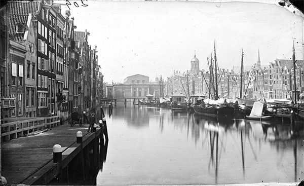 Het water waarover gesproken werd, is het Damrak, gezien in de richting van de beurs van Zocher, gesloopt in 1903. Rechts daarvan de koepel van het Paleis op de Dam. Links staan de achterhuizen van de Warmoesstraat tot in het water. De houten brug op jukken is de Papenbrug. Het Damrak tussen beurs en Papenbrug werd in 1875 gedempt en dat tot de Oudebrug in 1883.