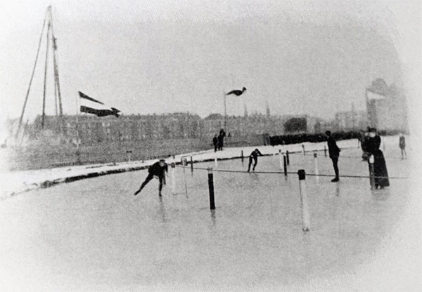 Op de middelste foto het IJsclubterrein tijdens het WK in 1893, op de onderste foto Anne Frank op de schaats.