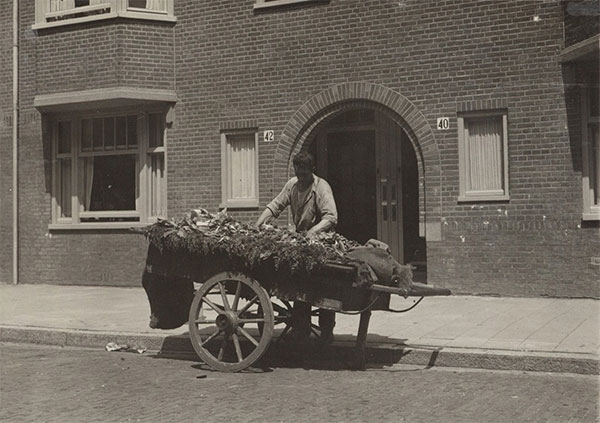 De schillenboer in 1935. Menig lezer zal het zich nog herinneren: de man die met z’n handkar groente- en fruitafval ophaalde. De bedoeling was het tegengaan van voedselverspilling, maar voor menigeen was het een bittere noodzaak om een centje te verdienen. De ophalers verkochten het aan boeren, maar het waren soms de arme boeren zelf die het groene afval verzamelden om als veevoeder aan hun dieren te geven. Pas ergens eind 80er jaren werd het gebruik van dit afval verboden en verdween de schillenboer uit het straatbeeld. Zo’n tien jaar geleden verschenen ze bij wijze van proef weer. Het beroep staat trouwens nog in de Nationale Beroepengids!