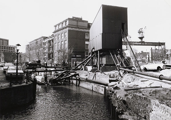 De fotograaf stond aan het eind van de Krom Boomssloot even zijde en keek in de lengterichting van de Snoekjesgracht richting Jodenbreestraat, waar het Goslerhuisje op de Sint Antoniessluis nog net te zien is. Dit alles ten tijde van de aanleg van de Metro Oostlijn. Daarbij werd gebruik gemaakt van een door een compressor aangedreven zeefinstallatie, verpakt in een grote 'doos'. Volgens Kees Dalmeijer was die bedoeld voor de archeologen.