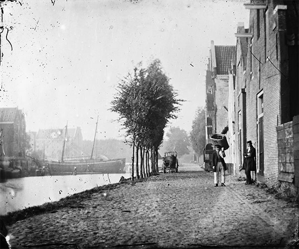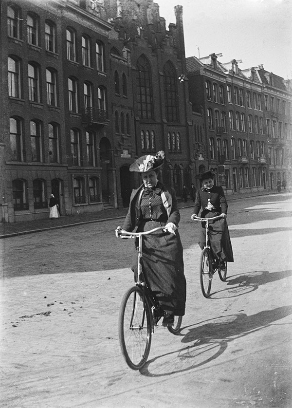 J. Rombouts, de ‘snapshot’-fotograaf van het begin 20e eeuw, legde deze keurig geklede fietsende dames vast. Vrouwen beschouwden deze nieuwe ‘machine’ als een manier om meer bewegingsvrijheid dus onafhankelijkheid te krijgen. Helaas was hun kleding nogal onpraktisch. Zoals een krant al in 1895 berichtte: “Zij kunnen het rijwiel niet zoo makkelijk beklimmen, en er niet zoo vlug afspringen; hare rokken loopen gevaar in de wielen verward te geraken, de wijde plooien van hare japonnen vangen te veel wind”. Uiteraard was er weerstand tegen fietsende vrouwen; vooral als zij dit als sport wilden beoefenen. Het weerhield deze twee langgerokte dames in ieder geval niet zich op een verlaten doch brede weg op het rijwiel te begeven. Bonusvraag: welke religieuze instelling zien we op de achtergrond?