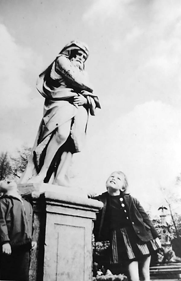 Het verraste mij: een beeldentuin in Artis. In 1863 legde men een tuin in Franse stijl aan, Hollandse tuin genoemd. Na het overlijden van één der oprichters, dr. G. F. Westerman, kreeg beeldhouwer B. van Hove de opdracht een gedenkteken te maken. Deze acht meter hoge zuil met allegorische elementen werd in deze tuin in 1891 onthuld. De dierentuin bezat meer beelden: vier stenen beelden die de vier seizoenen voorstelden. Trouwens, tot 1921 was een etnografisch museum onderdeel van de dierentuin; hier waren o.a. beelden uit Nederlands-Indië te zien. De vier seizoenen kregen pas in de jaren 30 een vaste plek in deze tuin. De zusjes Muller staan hier bij een kouwelijke Winter. Vaag op de achtergrond zie je het gedenkteken (onderste foto).